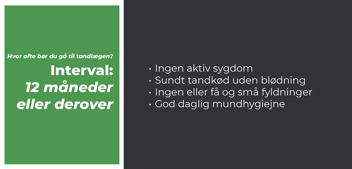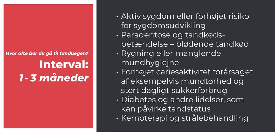 Har du aktiv sygdom, høj risiko for ny sygdom eller forværring af eksisterende sygdom, bør du gå hyppigere til tandlæge eller tandplejer, end hvis du aldrig har haft tandsygdomme, ikke har nogen sygdomsaktivitet og har en lav risiko.