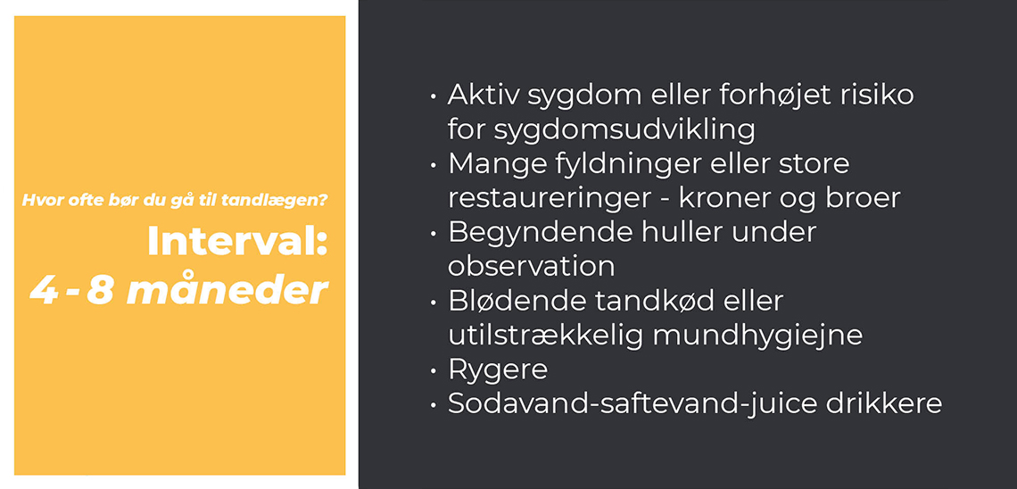 Tiden mellem dine tandlægebesøg behøver ikke at være den samme hele livet. Din livssituation kan ændre sig, ligesom forhold i mundhulen kan ændre sig. For eksempel hvis du får sygdom i tænder og mund efter mange år uden problemer.